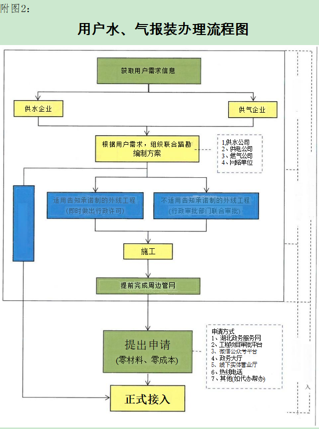 (一)免費申請。 用戶通過政務服務網、供水供氣網上營業(yè)廳、微信公眾號、各營業(yè)網點等方式提出用水用氣接入申請。