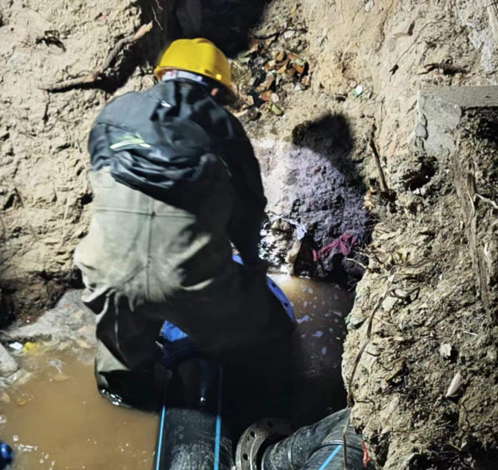 “末端”不末尾,問(wèn)題不過(guò)夜。欣和電子位于高新區(qū)供水管網(wǎng)最末端,周邊聚集了多家24小時(shí)連續(xù)生產(chǎn)的企業(yè)。廠區(qū)用水報(bào)裝需在DN200管網(wǎng)破口接水,新安裝DN100機(jī)械表,既要穿越車(chē)流滾滾的主干道,又不能影響“鄰居”們一滴水的正常供應(yīng)。接到求助后,水務(wù)集團(tuán)建設(shè)工程公司立即啟動(dòng)“高新企業(yè)用水綠色通道”,青年突擊隊(duì)成員10分鐘集結(jié)完畢,技術(shù)骨干連夜踏勘現(xiàn)場(chǎng)。