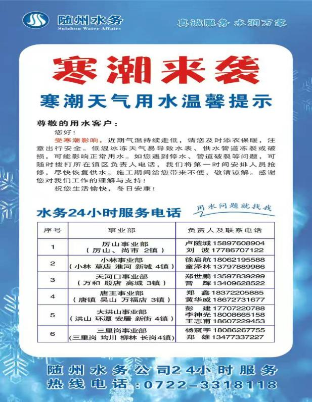 近期,我市持續(xù)遭遇低溫寒潮,嚴寒天氣對城鄉(xiāng)供水管網(wǎng)及設(shè)施構(gòu)成嚴峻挑戰(zhàn),水務(wù)集團隨縣供水公司迅速激活應(yīng)急響應(yīng)機制,提前部署筑防線、精準服務(wù)解民憂、全員堅守保暢通的硬核舉措,切實保障居民冬季用水無憂。