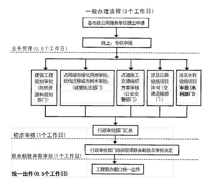 并聯(lián)審批辦理總時(shí)限:告知承諾制項(xiàng)目無需批前審批,由城 管、交通、公安審批部門加強(qiáng)現(xiàn)場(chǎng)實(shí)施監(jiān)管;一般審批項(xiàng)目3個(gè) 工作日(不含方案和評(píng)價(jià)報(bào)告編制時(shí)間、方案評(píng)審時(shí)間、申請(qǐng)人修改、審批前公示或公證時(shí)間)。